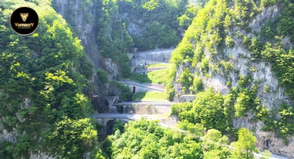 Senza tecnologie moderne, furono scavati cinque tunnel nella roccia, tracciati tornanti e costruiti ponti capaci di reggere artiglieria pesante. Il risultato è ancora oggi sorprendente: una pendenza costante intorno al 10–12%, perfetto equilibrio tra ingegneria e natura.