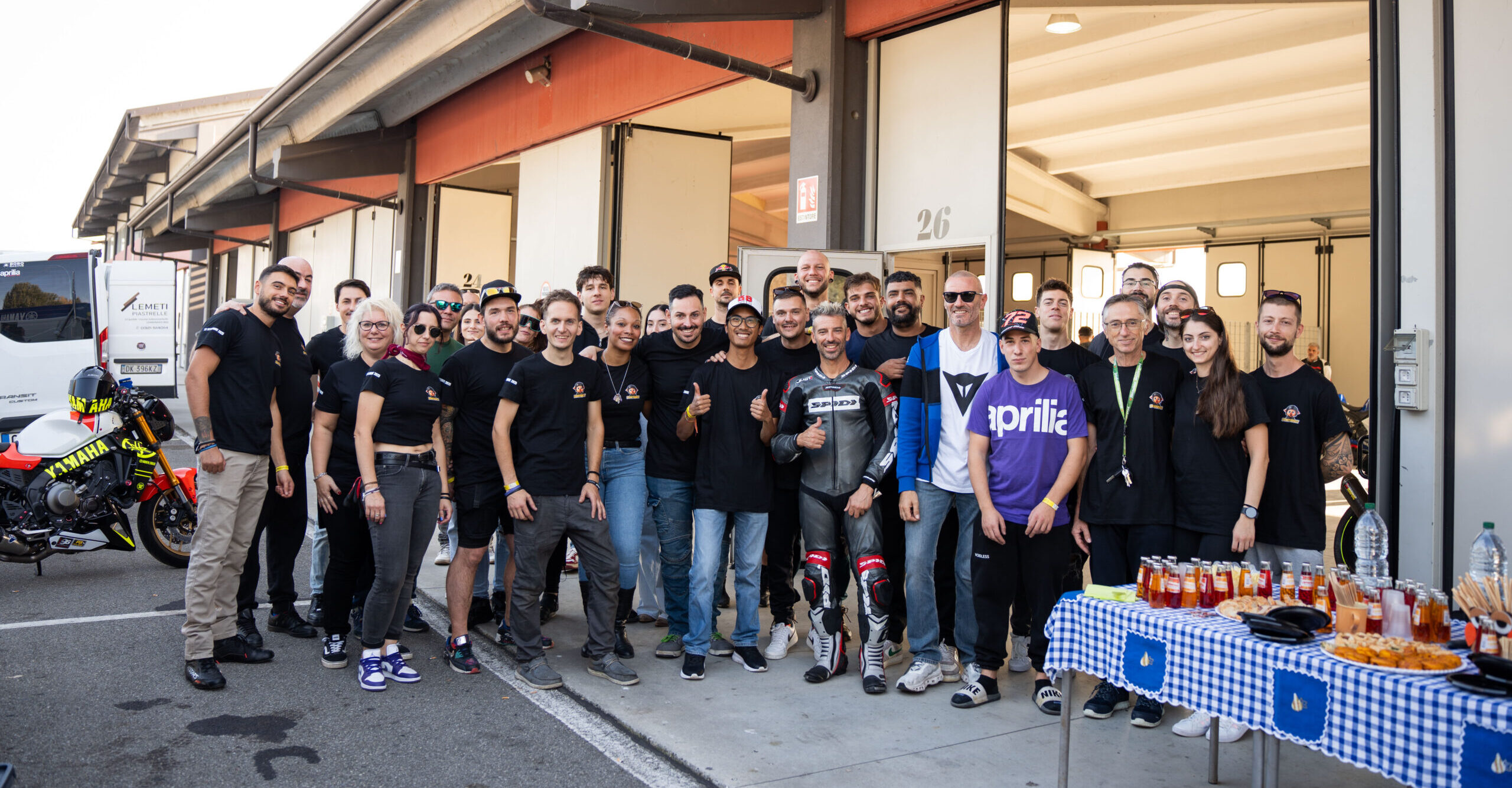 Con Noi c’erano Luca Pedersoli e Marco Melandri — presenza che ha fatto battere forte i cuori di tutti, ma la vera protagonista è stata la comunità: volti sorridenti, caschi appoggiati sul tavolo e mani che brindano al tramonto.
